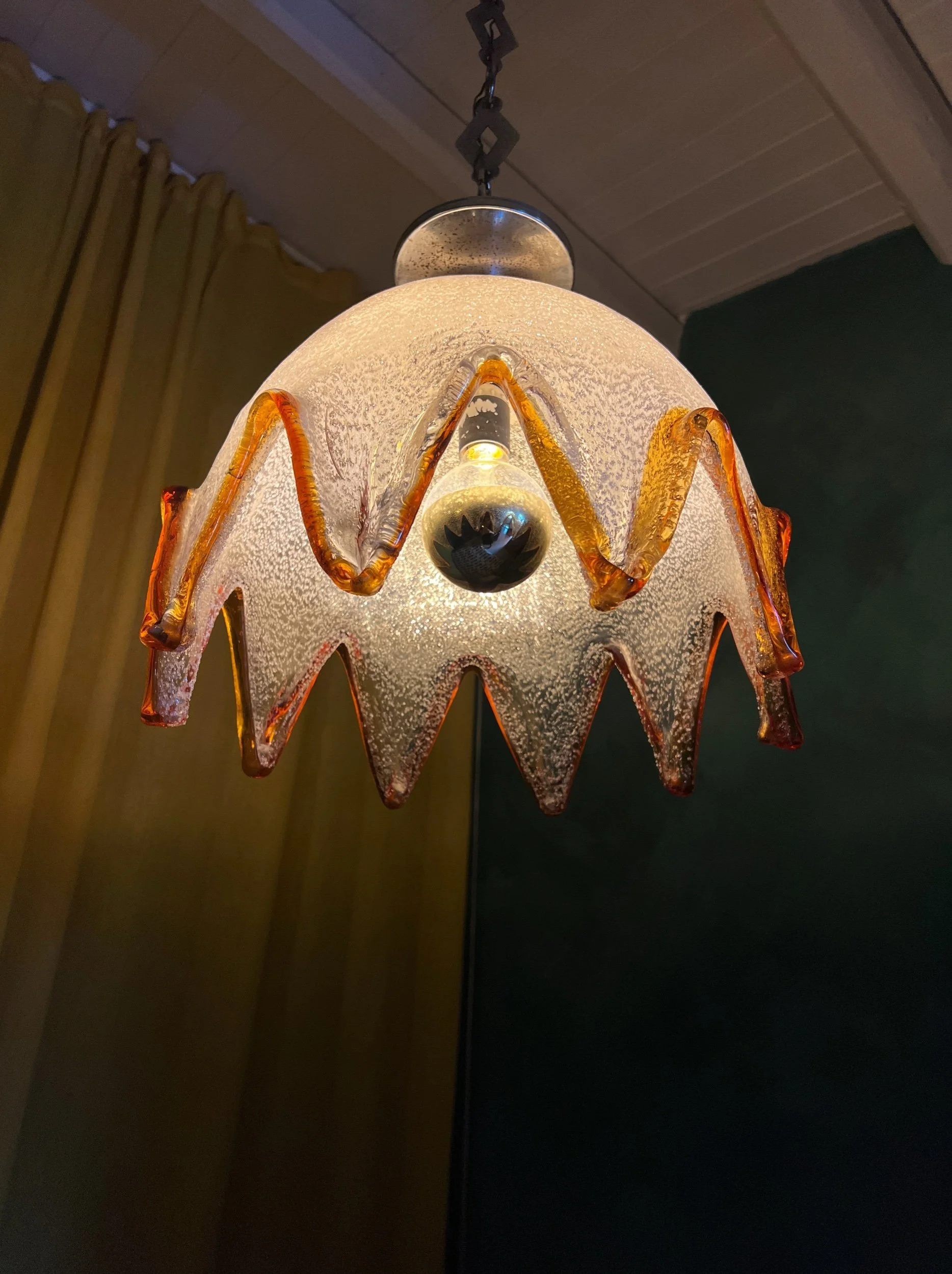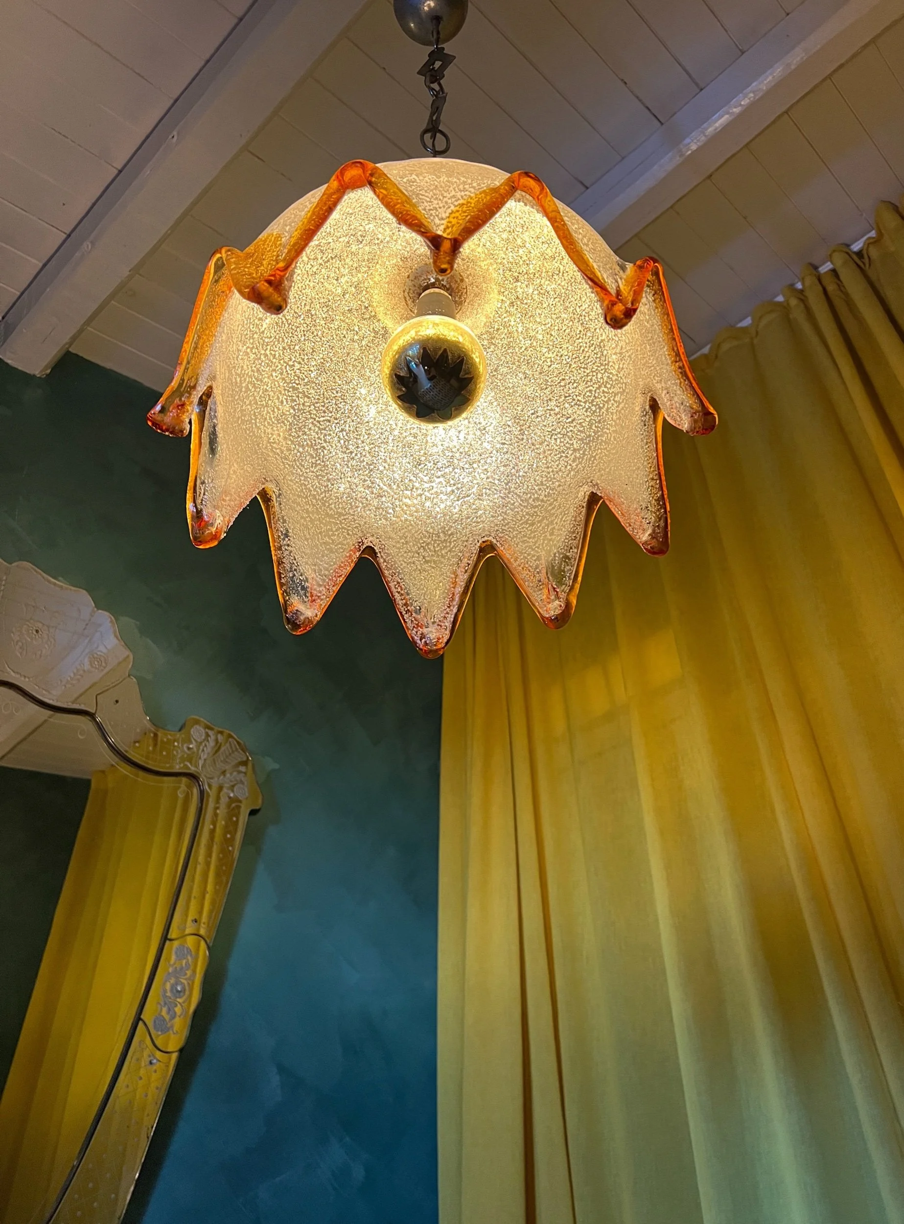 Amazing 1970s Pendant Light by Mazzega Murano A stunning pendant light from the 1970s, crafted by Mazzega Murano. The lamp features a beautiful flower-like shape in clear glass, accented with a delicate caramel colored rim that adds warmth and character to the design.