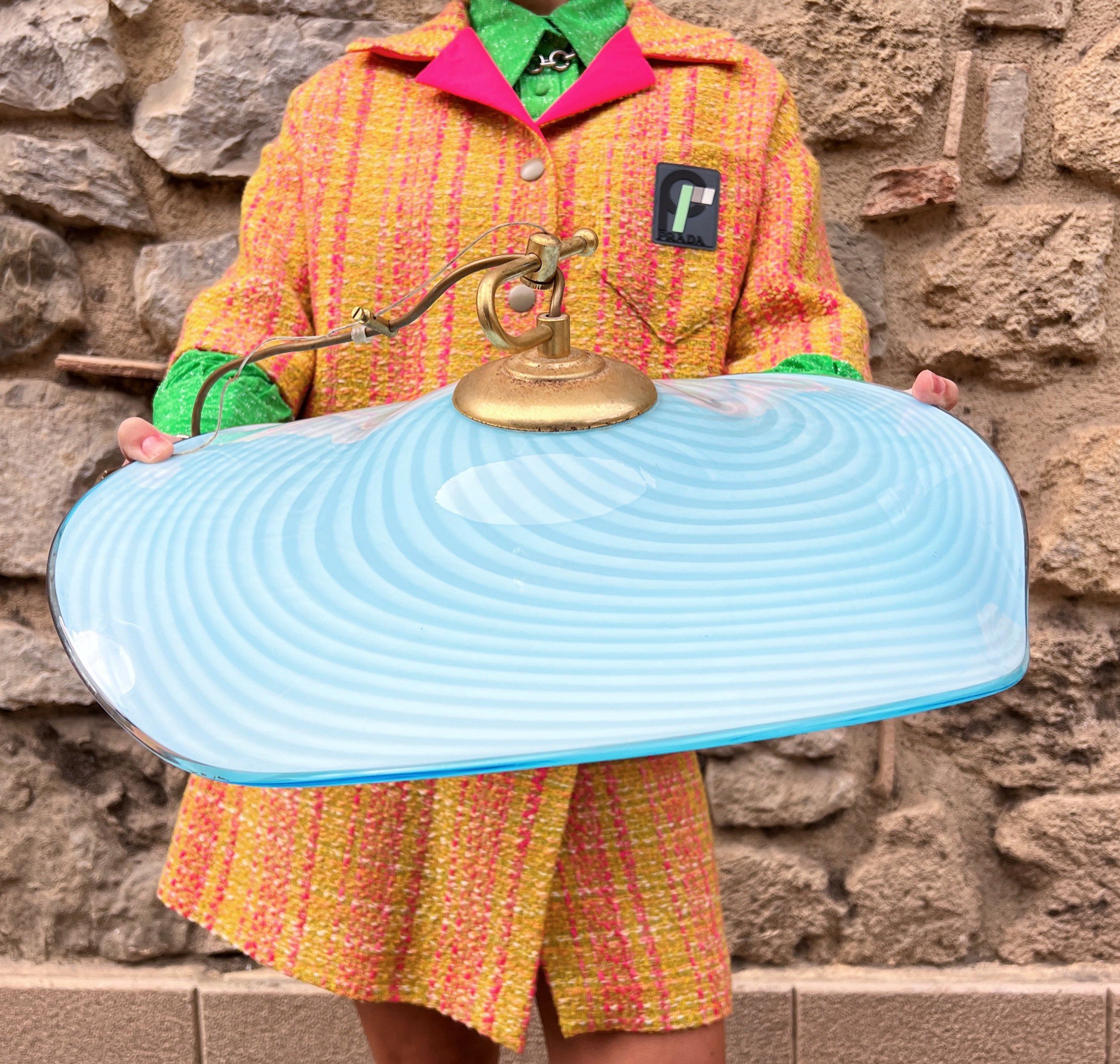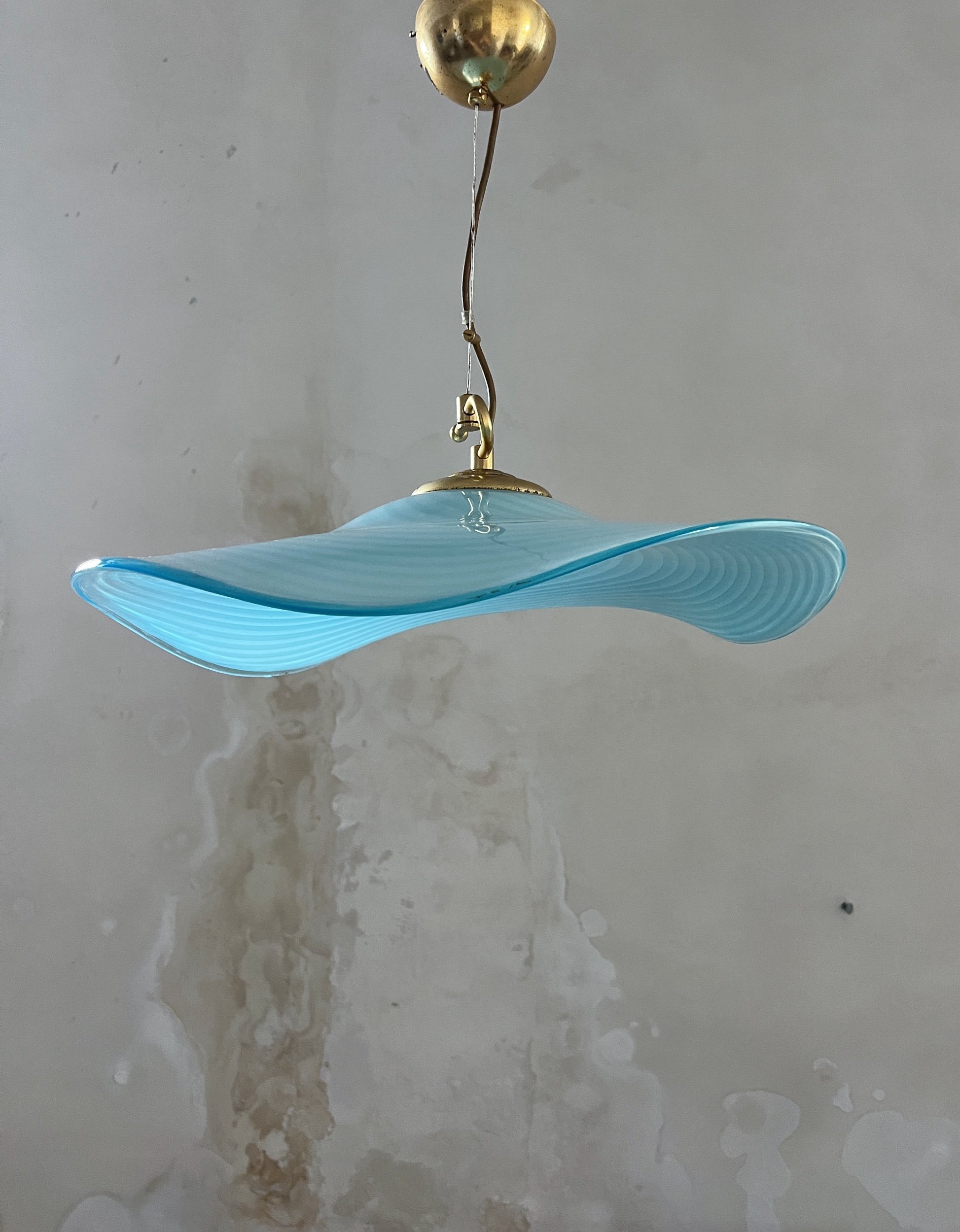 The glass features a beautiful blue swirl pattern, where soft, flowing shades of blue are suspended within clear glass. This creates a mesmerizing sense of depth and movement, showcasing the artistry and technical mastery of Murano glassmakers. The blue coloration itself is magnificent, capturing and reflecting light in a way that feels both tranquil and vibrant. The canopy shows visible signs of age, as part of the gold coating has worn off over the years. It can be replaced if you prefer, though some may appreciate it as an authentic vintage detail. Overall, this pendant lamp is a rare and captivating example of Murano craftsmanship, elegant and timeless, and perfect for adding a touch of Italian artistry to any interior.