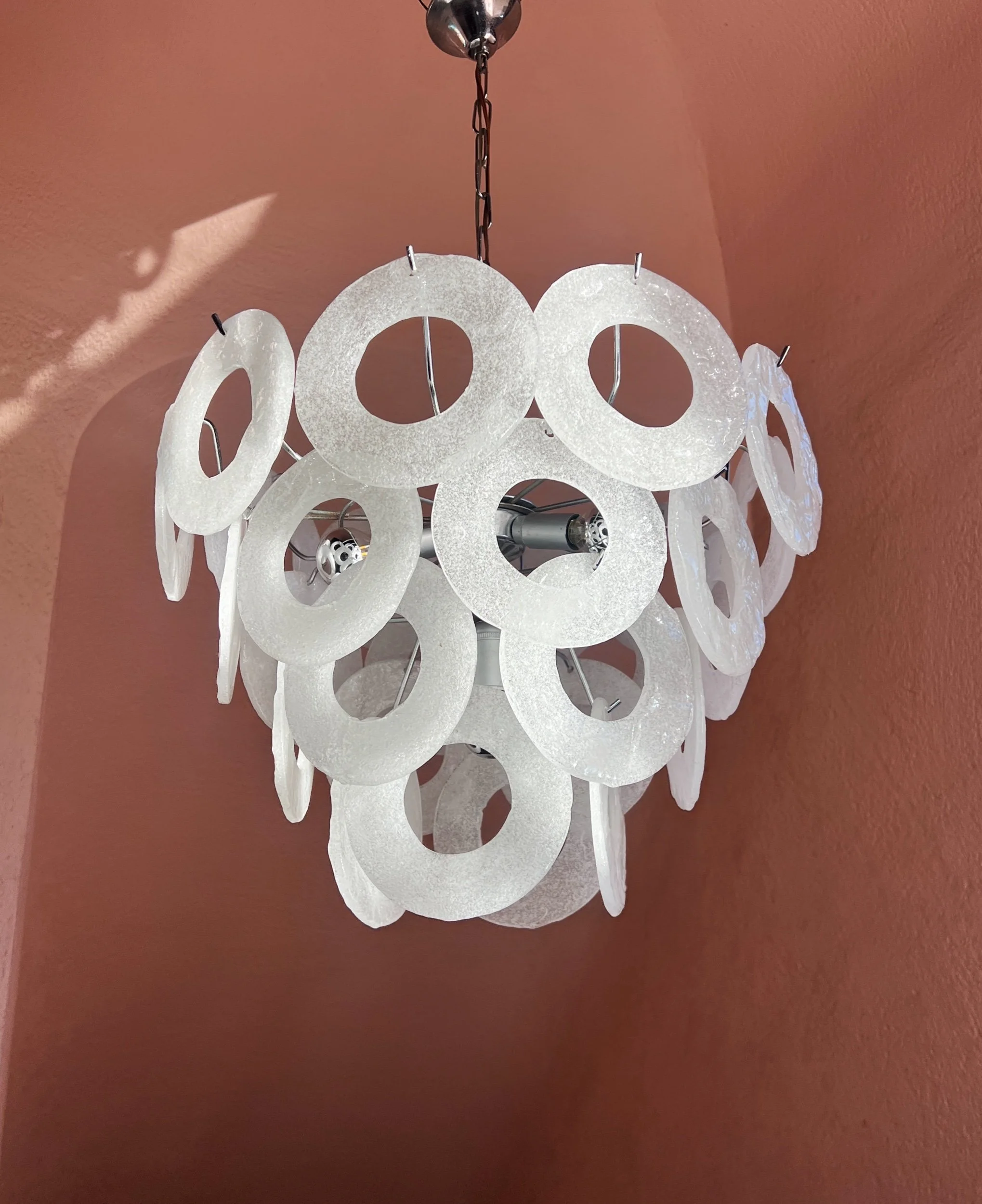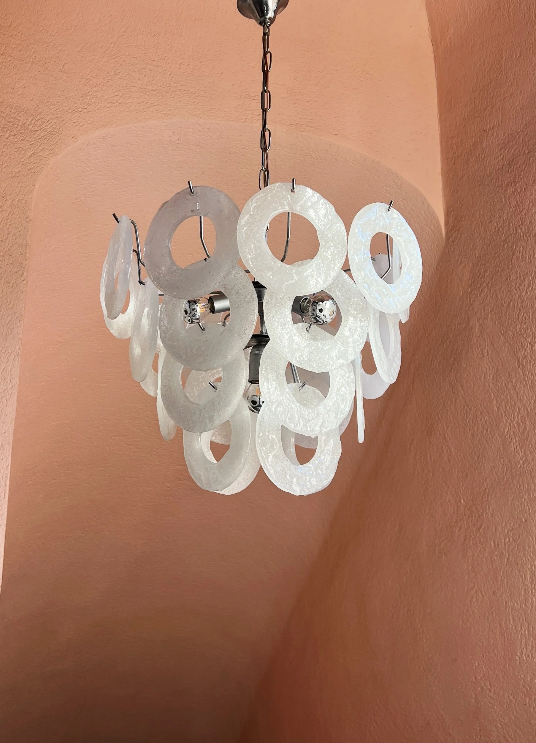 This elegant Murano glass chandelier is a beautiful example of Italian craftsmanship from the island of Murano, renowned worldwide for its artisanal glassmaking tradition. The lamp features multiple hand-formed glass discs in a soft white, each with subtle surface texture that catches the light gently.