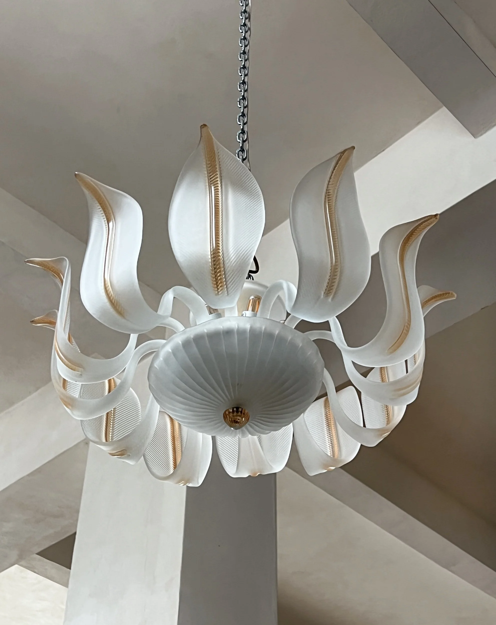 A refined Murano glass ceiling lamp composed of softly translucent glass leaves with a milky white tone, each featuring a warm caramel detail at the center. The leaves form a graceful circular composition that creates a gentle, diffused light with a beautiful glow.