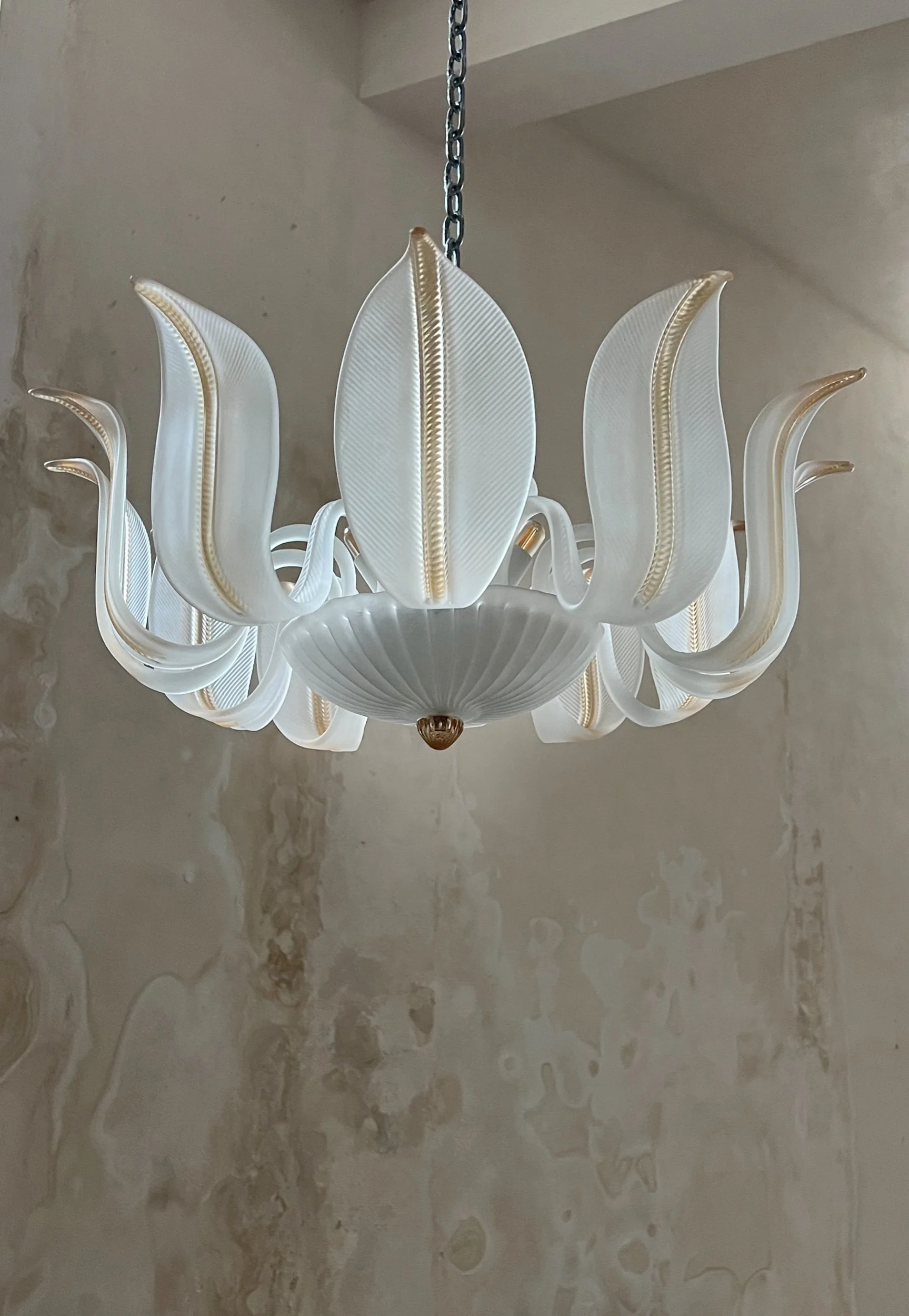 Please note that the lower glass base / round plate, has a small crack, which is not visible once the glass leaves are mounted. Kindly refer to the photos for more details. The lamp has six E14 sockets. A poetic example of Murano craftsmanship.