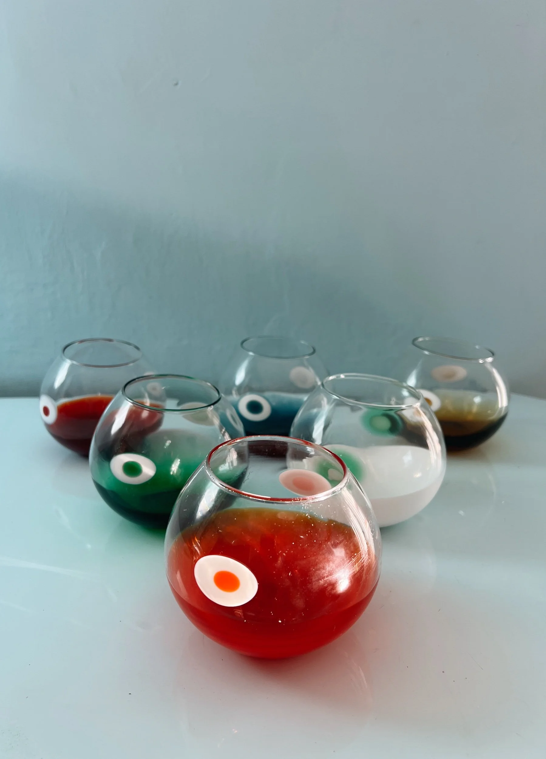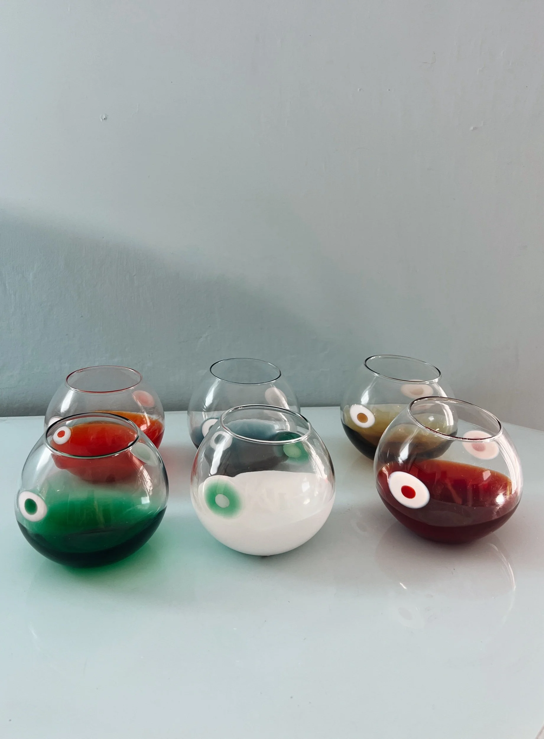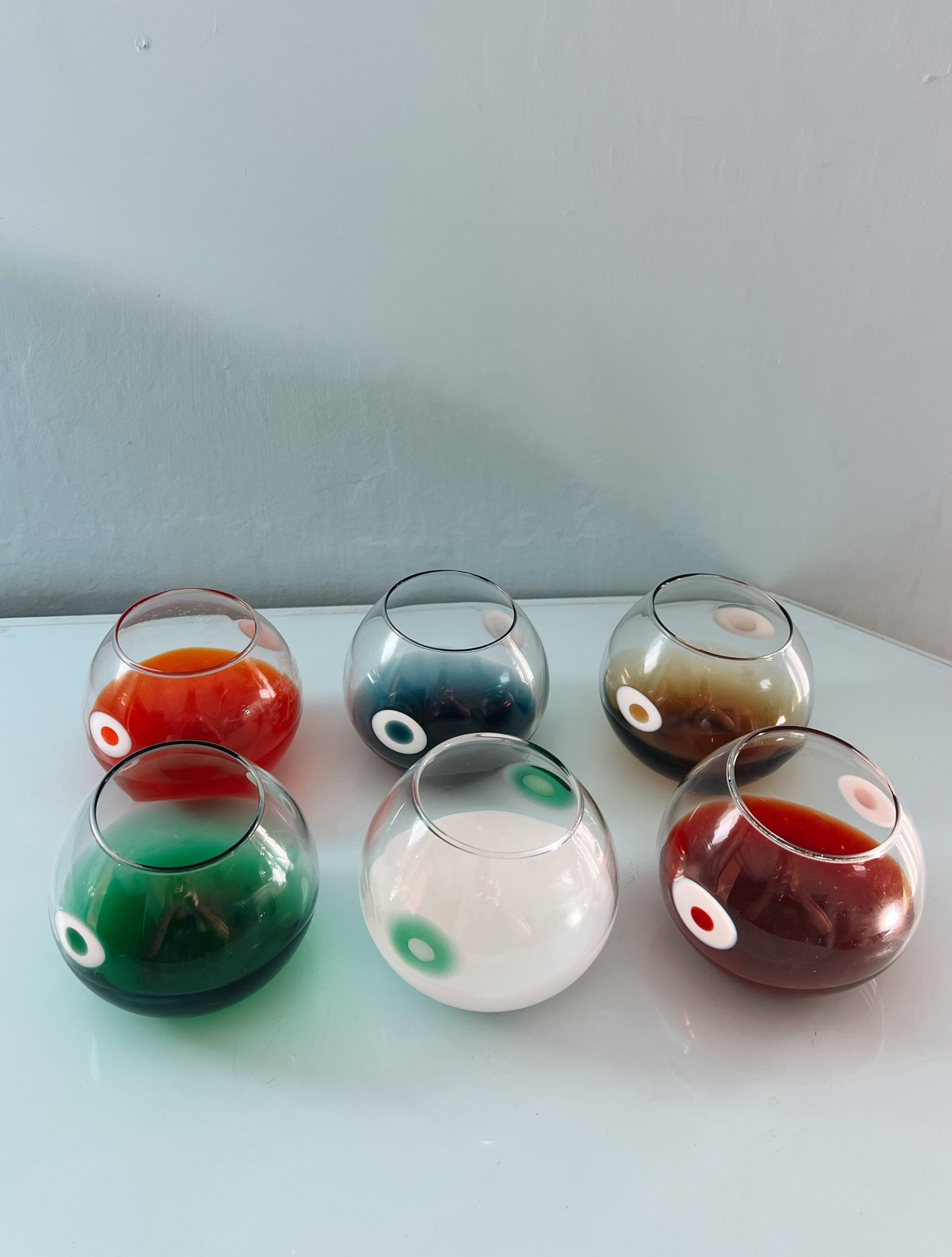 Stunning set of six Murano drinking glasses, each uniquely crafted in a different vibrant color, making them a perfect blend of pop art and elegance. Dating back to the 1970s, these glasses showcase exquisite Murano craftsmanship, with a playful spot design on each side. The vibrant hues and playful pattern make these glasses not only functional but also striking decorative pieces for any table setting.