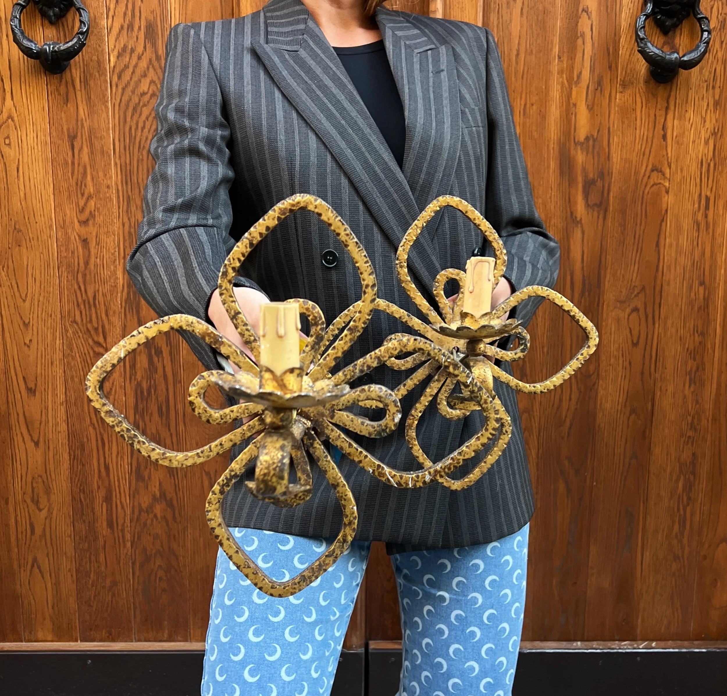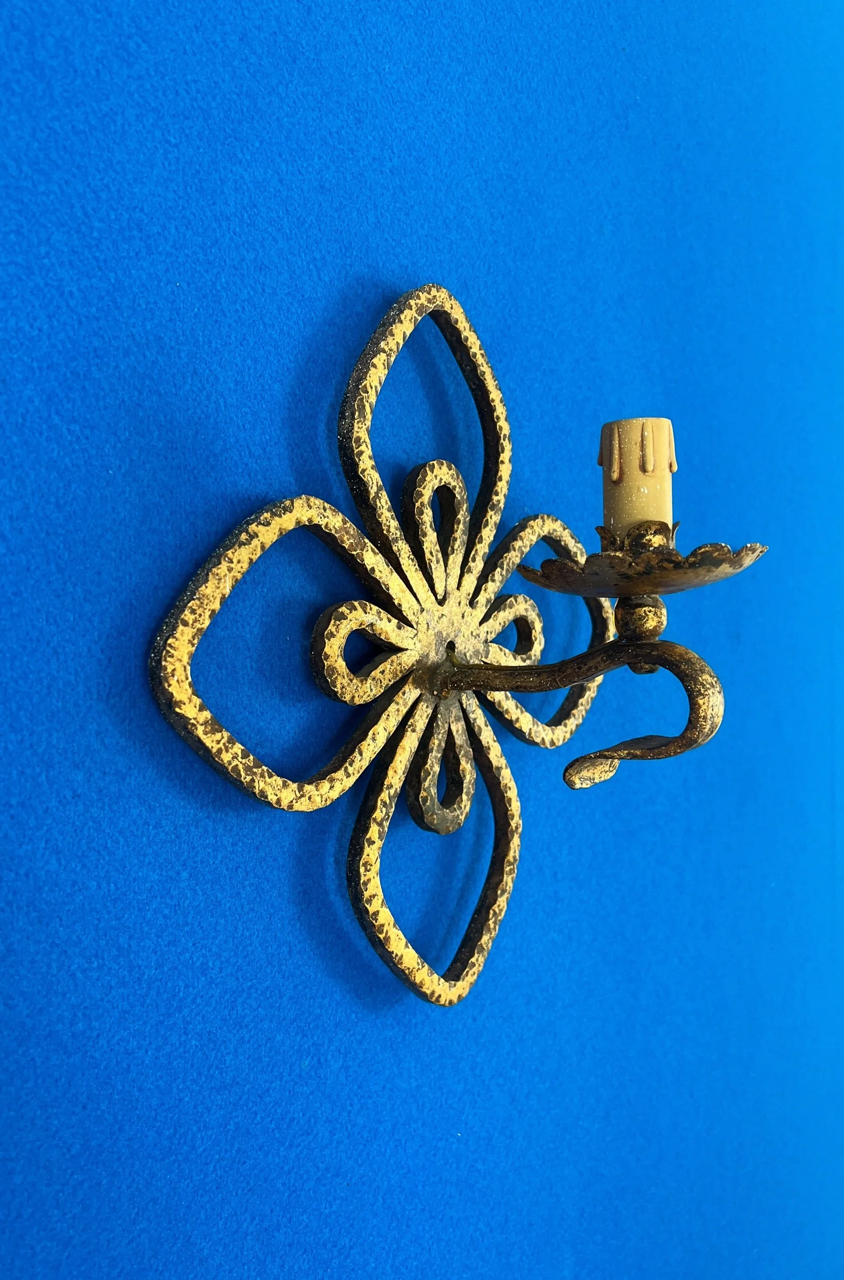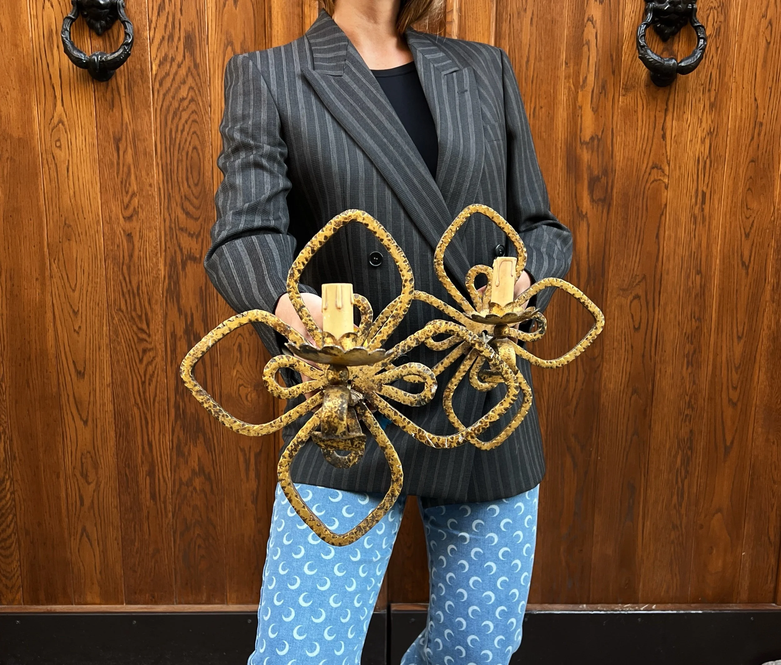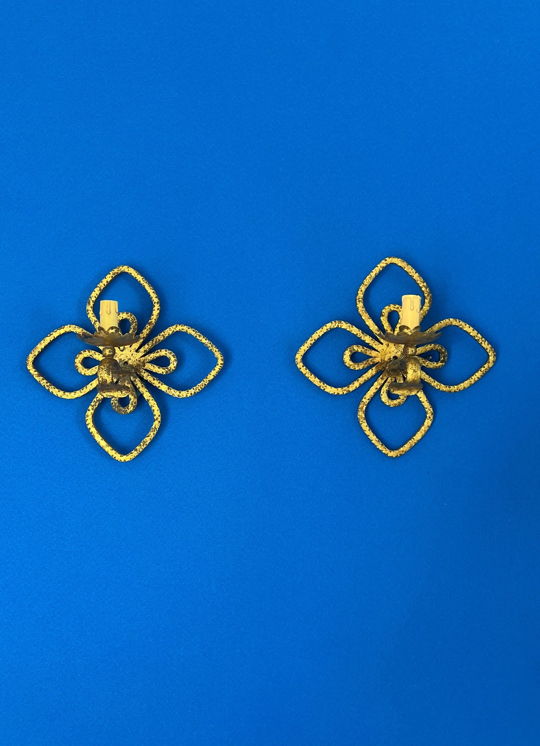 These exquisite wall sconces, hand-forged and gilded in the 1950s by Pier Luigi Colli, are a beautiful example of the designer’s poetic approach to decorative ironwork. Shaped as stylized four-leaf clovers, they combine playful symbolism with exceptional craftsmanship. The iron structure is not only forged by hand but also richly textured with the subtle, dotted surface that is characteristic of many of Colli’s finest iron designs. This artisanal detailing gives the metal an almost tactile, jewel-like quality that enhances the depth of the gilding.
